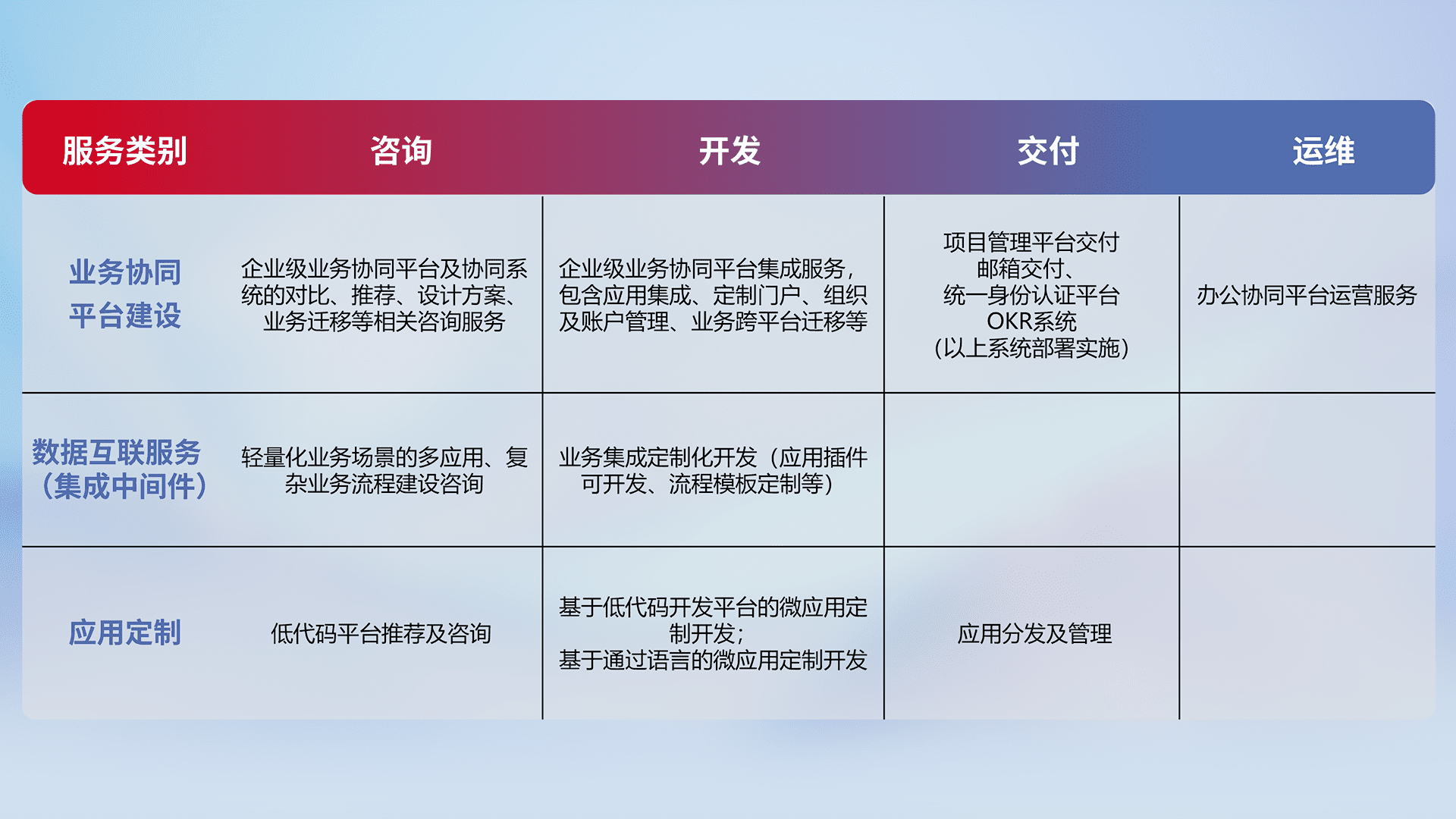 针对钉钉、、、企微、、、、IDaas等平台级产品提供产品的规划、、、方案、、、、交付、、、、定制化开发等服务,,,实现如统一协同办公、、、、智能客户服务、、、混合会议管理、、、智能数据查询、、等业务场景,,,实现数字化转型。。。。